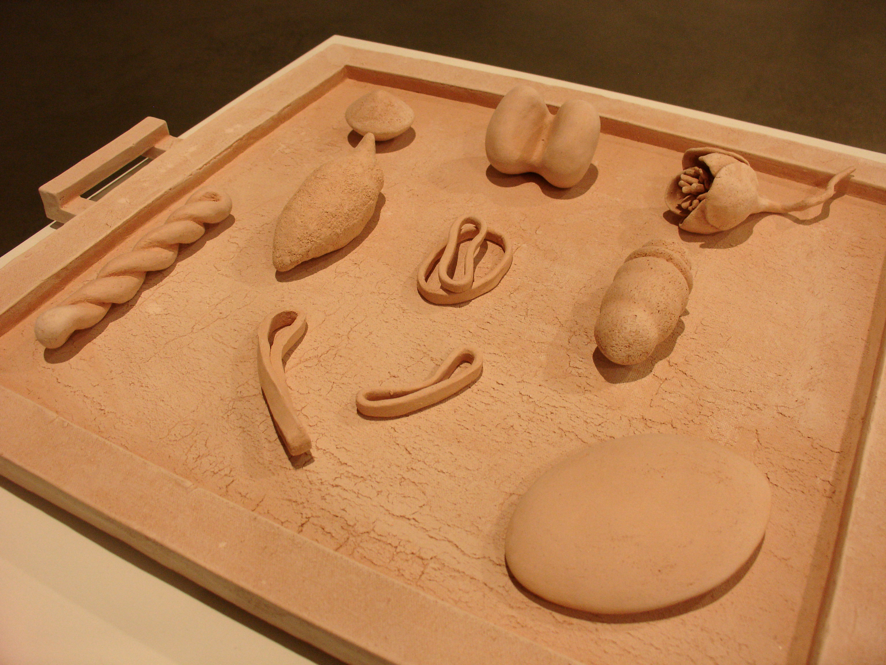 argile, céramique, fèves, 45 x 59 x 8 cm